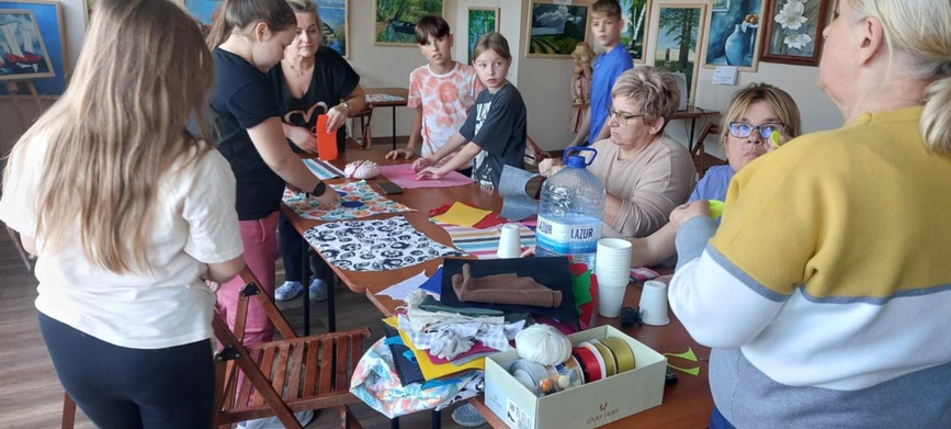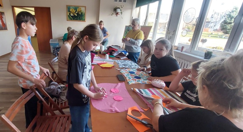 Po części teoretycznej uczestnicy przystąpili do praktycznej realizacji swoich projektów. Młodsi uczestnicy, pod opieką prowadzących, wycinali elementy poduszek według szablonów i łączyli je ze sobą przy użyciu prostych ściegów.